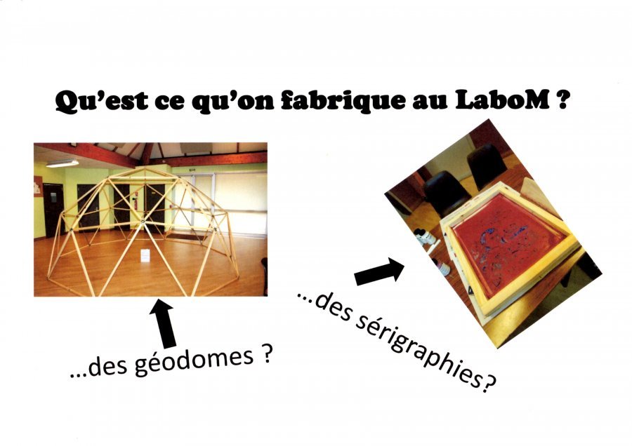 • l’organisation de rencontres hebdomadaires d’adhérents au sein du FabLab (contraction de l’anglais Fabrication Laboratory), un lieu où il est mis à disposition des outils numériques pour la conception d’objets innovants. Ouvert à tous sans distinction d’âge ou de connaissances, les mots d’ordre du Labo’ M sont : créer, concevoir, innover, échanger, partager, inventer, réparer !